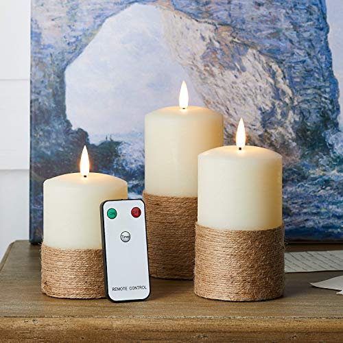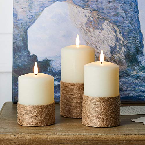 Lights4fun, Inc. Set of 3 TruGlow Rope & Ivory Wax Flameless LED Battery Operated Pillar Candles with Remote Control