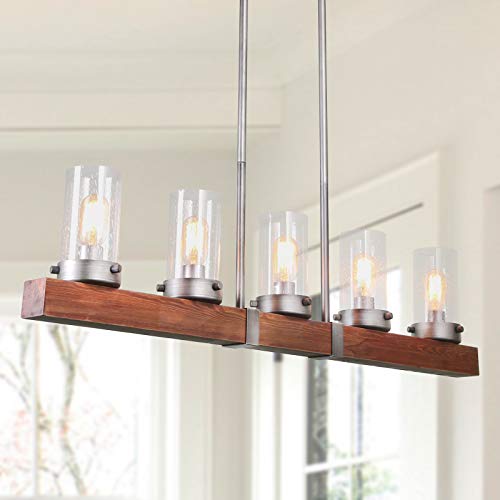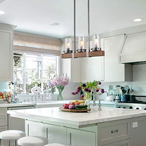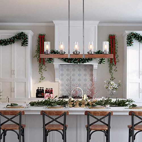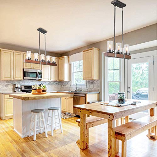 [DIMENSION of GLASS PENDANT LIGHT] – This kitchen light is 42. 9” (L) x 4. 6” (W) x 9. 4” (H), the 63 inches metal rod of farmhouse pendant light is adjustable, you’ll be able to adjust this wood chandelier lighting by the rods to 13″, 33″, and 63″.