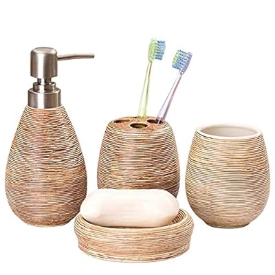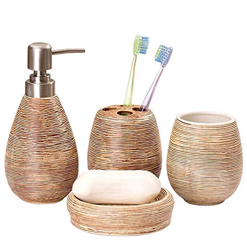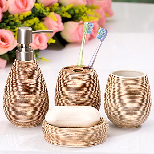 Contemporary deluxe ceramic 4 piece bathroom accessory set includes 1 round soap dish, 1 lotion/soap pump dispenser, 1 toothbrush holder and 1 tumbler.