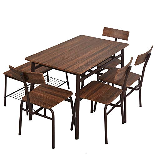 Industrial style table set includes 1 rectangular table ,4 chairs and 1 bench, rustic brown color