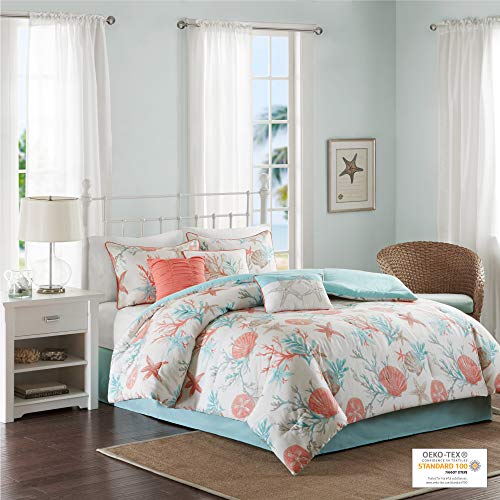 For a vibrant coastal update to your bedroom, the Madison Park Pebble Beach 7 Piece Comforter Set is perfect for you! This cotton comforter and shams feature a starfish and coral motif in vivid colors to brighten your space. The solid reverse adds a splash of color to complement the coastal design. Three decorative pillows with embroidery and fabric manipulation add dimension to your top of bed, while a solid bed skirt adds the finishing touch. This bedding set is also OEKO-TEX certified, meaning it does not contain any harmful substances or chemicals to ensure quality comfort and wellness.