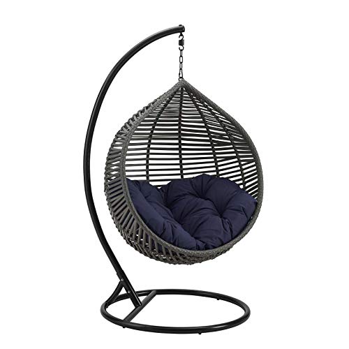 Calmly sway from side to side from the protected comfort of the Garner Teardrop Outside Patio Swing Chair with Stand. This stylish up to date Outside hanging chair comes with a durable powder-coated steel frame wrapped in an enduring PE wicker rattan weave, hanging steel chain, and steel stand. Complete with a soft all-weather tufted polyester fabric cushion, this versatile hanging chair is a welcome update to your deck, porch, patio, or inside your house as a fun swing chair for the bedroom or living room. Enjoy a relaxing seating experience from the comfort of this teardrop hanging chair with steel stand. Chair Weight Capacity: 265 lbs.