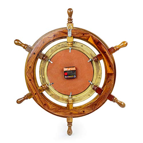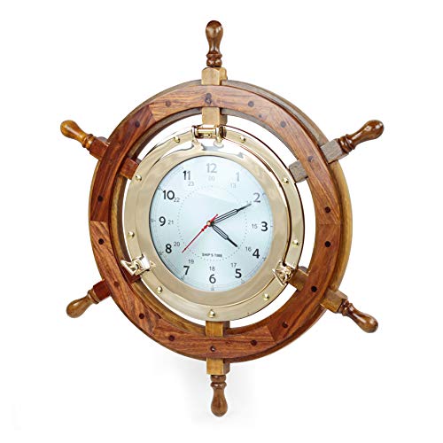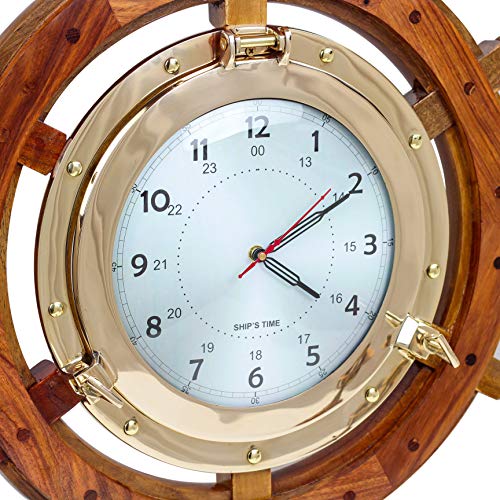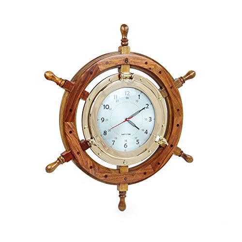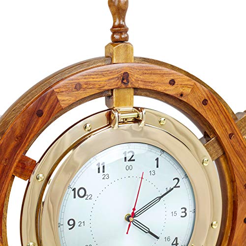 Premium Teak Solid Wooden | Hand-crafted Nautical Ship’s Wheel With Solid Polished Brass Porthole Clock | AA Battery (No longer Included)