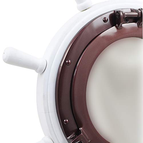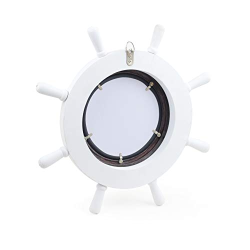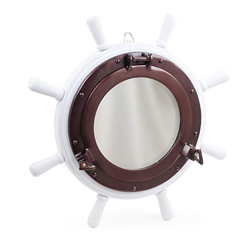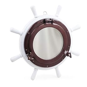 Nautical Wooden Handcrafted Premium Wood Pirate’s Steering Ship Wheel With Antique Aluminum Porthole Mirror. This is a beautiful nautical decor as you must see it through the pictures and has been wonderfully done and crafted the usage of the Solid Wood. It features a hand painted white finish which actually compliments the antique brown porthole mirror. It’s unquestionably going to beautify the homes and offices . This isn’t some made in China stuff but a real quality one and I m sure you shall find it even more lovely in person. Keep exploring Nagina International for lots of more decor and size options. we have now got some actually exciting product and you shall love something.