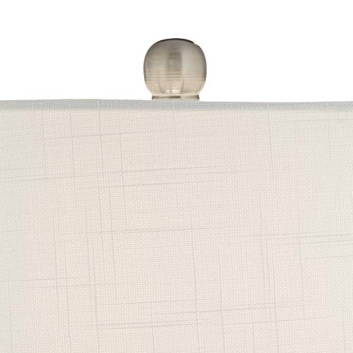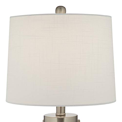 Silver brushed nickel finish metal accents. Off-white poly-fabric tapered drum shades. 7-foot long cords. French-style cord exits from the socket.