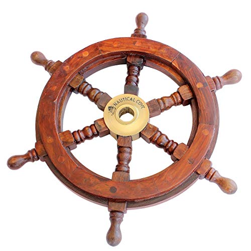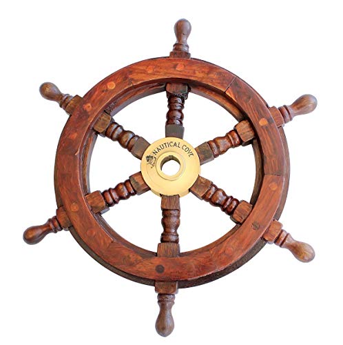 This 12″ Pirate Wooden Ship Wheel is perfect for your nautical home or boat decor! It is made out of India Teak wood and hand-made, stained, and polished. The Nautical Cove logo has been finely etched onto the center brass hub. The wheel measures 12″ from tip to opposite tip, the circle itself is 8.5″ in diameter, and the center brass hub is 2″ wide. The wheel is 1 1/4 in high.