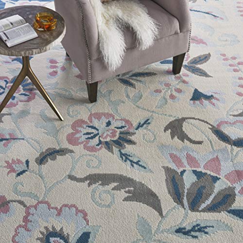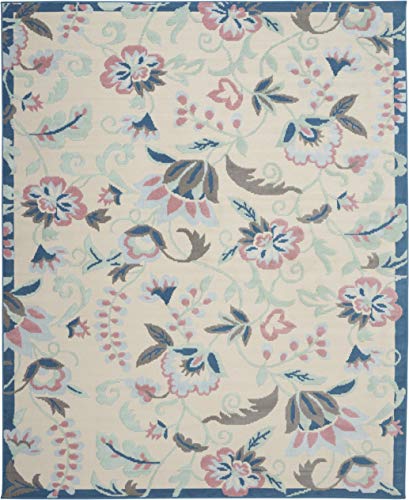 A botanical fantasy of flowers tumbles over the slender borders of this charming rug from the Jubilant Collection. A gentle palette of blue, pink, and ivory plays out on low-pile easy-care fibers, for a casual charm that brightens any space in the home.