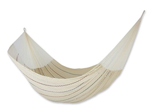 About this item: Red and blue are woven into a beige hammock that promises a delightful rest. Mexico’s Maya Artisans of the Yucatan keep tradition alive by weaving this cotton hammock with the same techniques developed by their Maya ancestors. The hammock’s loops are crafted with nylon threads. Long before the Spanish arrived upon the coasts of the Yucatan Peninsula, the Maya preferred to sleep and rest in hammocks. They considered the hammock to be like the loving embrace of a mother, due to the comfortable manner in which the body is held and swung within its cradle. Maya Artists of the Yucatan seek to preserve time-honored customs while also offering stylized versions of the original Maya hammock. For them, the hammock is a work of art. Their hammocks are incredibly comfortable, easy to maintain, and may be stored just about anywhere.