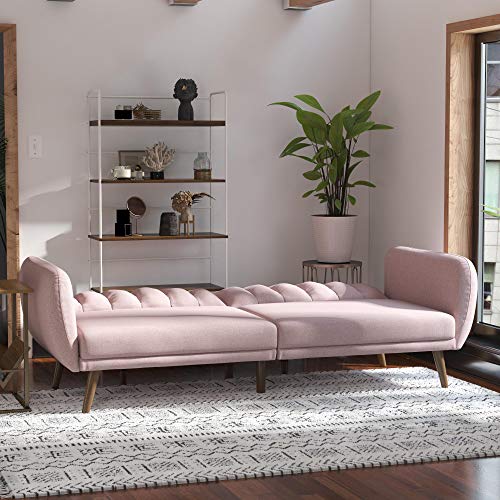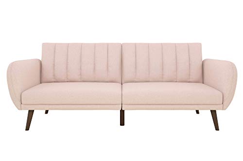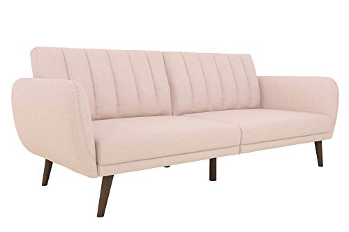 Be embraced by the comfortable cushioning of the Novogratz Brittany linen futon. With its ribbed tufted cushioned back, the Novogratz Brittany Linen futon gives your body all the support you need to sit and relax for hours. The combination of curved armrests and slanted legs work together to provide a unique rounded look that stands out. The linen upholstery adds another element of elegance, making this a perfect statement piece for any living space. It features comfortable polyester and foam filling with slanted oak colored wood legs.