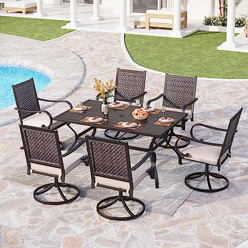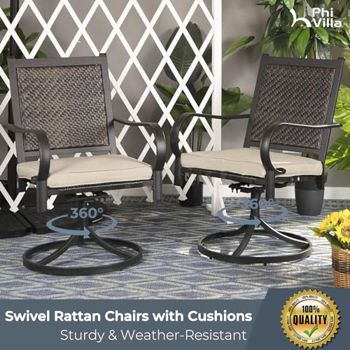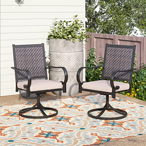 【360 Swivel Design】Upholstered dining chairs set of 2 can rotate freely and smoothly in 360 degrees makes it more comfortable.Fabric of the seat cushion (with zipper) is aolifen & staple fiber,requires no special maintenance. Wrought iron patio dining swivel wicker chairs are suitable for various scenarios, indoor, Out of doors garden, balcony, deck, park, patio, porch, poolside, yard, corridors, sun rooms, and so on., for a family to sit down and dine together