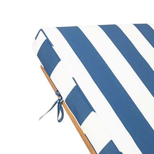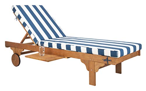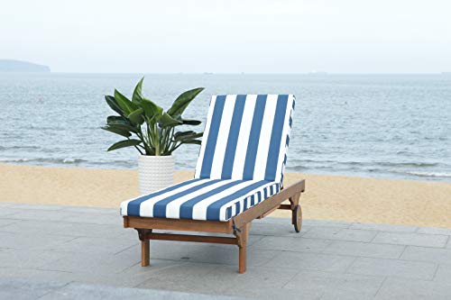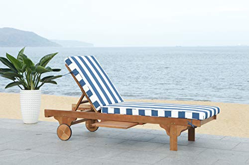 A transitional update of a cruise ship classic, the Newport outside chaise lounge chair recalls dreamy days on a transatlantic crossing with its white and navy striped fabric and brown finish on eucalyptus wood. Carved front legs and back wheels allow for simple mobility, and a sliding table is Best possible for holding your refreshing drinks.