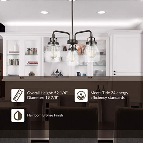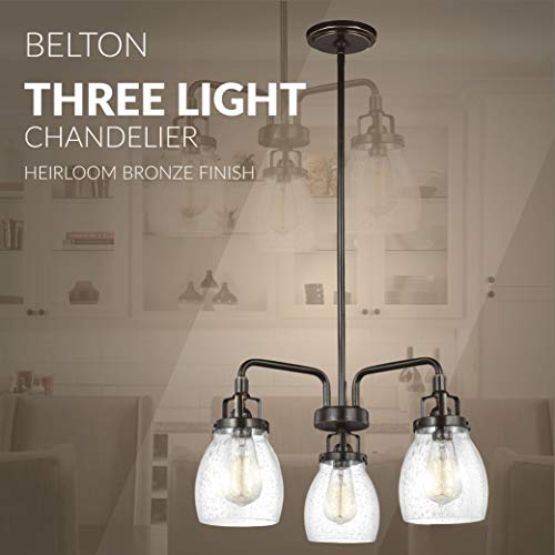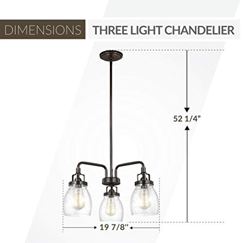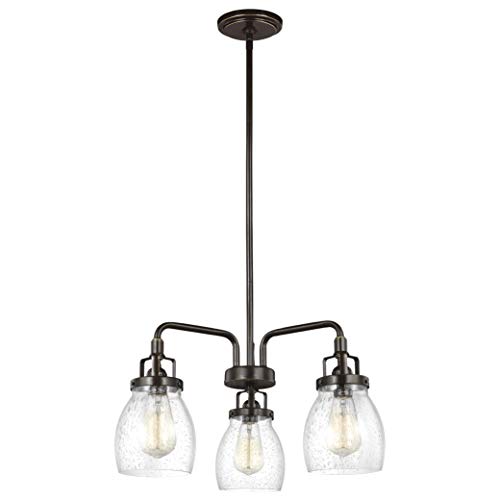 The Sea Gull Lighting Belton three light single tier chandelier in heirloom bronze provides abundant light to your home, at the same time as adding style and interest. Influenced by the vintage industrial designs of early 20th Century The usa, the transitional Belton lighting collection by Sea Gull Lighting has Seeded glass shades that highlight the classic Edison bulbs. The rich Heirloom Bronze and Brushed Nickel finishes adds to the layer of unfashionable design to the warm look. The assortment includes three- and five- down light chandeliers; five-light upright chandelier; a four-light island pendant; one-light pendant; one-light mini pendant; and one-, two-, three- and four-light bath fixtures. All fixtures are California Title 24 compliant and easily convert to LED by purchasing LED lamps sold one at a time.