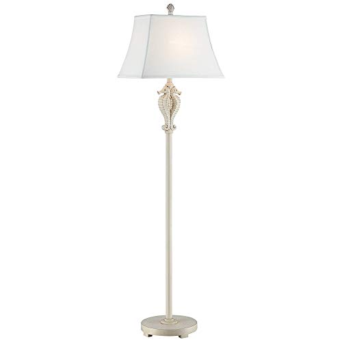 This sophisticated coastal floor lamp includes a tall, slender stand with a pleasing, realistic accent of sculpted seahorses close to the highest. Finished in a soft antique white, it has a easy round, footed base and a charming seashell finial. Topped with a complementary, off-white tapered square shade.