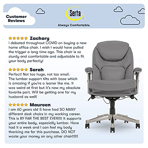 Help promote strength and flexibility in your back while you work with the Serta Ergonomic Executive Office Chair. This ergonomic office chair helps users become more productive and efficient by maximizing lower back support and comfort while seated. Its unique Back in Motion Active Seat Technology swivels the lumbar forward, providing the same effects as a pelvic tilt exercise by promoting spinal movement and flexibility in your core. Push-button adjustable armrests and pneumatic height adjustment allow the leather office chair to be quickly and easily customized to find the right fit for you. The multilayered cushions are soft yet supportive, so you’ll feel refreshed even after a long day.