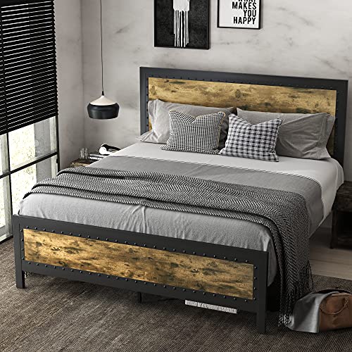 SHA CERLIN Grey Metal Bed Frame Queen / Industrial Wooden Platform Bed with Rivet Headboard Footboard / 13 Strong Metal…