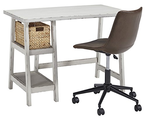 Space-challenged rooms call for simply chic style: like the mirimyn small home office desk in antiqued white. Clean and lean, this Desk’s classic trestle design always works. Heavily distressed finish captures the essence of chipped paint, giving this wood desk a charming salvaged quality. Pair of open shelves and natural water hyacinth basket provide essential storage.