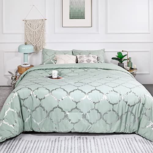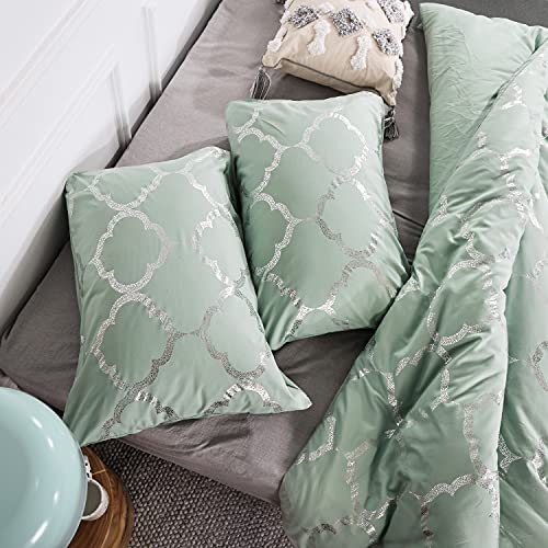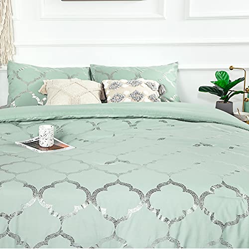 Smoofy Sage Green Metallic Print Bling Geometric Design Comforter Set 3pcs Moroccan Pattern Mermaid Luxurious Sea Green…