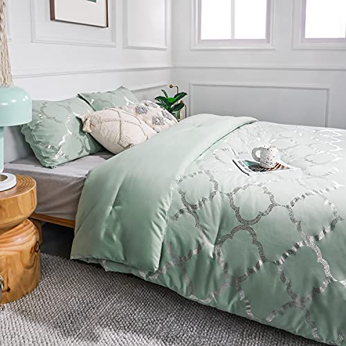 GLITTER METALLIC DESIGN: Print soft microfiber pastel sparkle sage green comforter set with moroccan silver design keeps you feel comfortable. Double-sided light green metallic shimmer bed set with cozy feeling helps you sleep quickly and experience better nights.