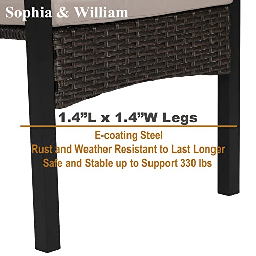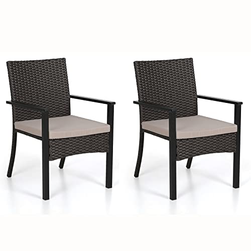 Free Cushions: Each chair is equipped with a 1.97″ thick cushion and it is made of high density inner filling sponge and water-resistant polyester cover. The cover is removable for easily cleaning. You’ll take it off when it is hot and the PE rattan seat and back can make you feel cool soon. It the cold weather, the thick seat cushion can bring you comfort and warmth