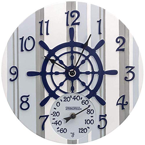 The Taylor 14 in. Captain’s Wheel Poly Resin Clock with Thermometer options a beautiful footprint-in-the-sand background of vibrant colours which can be fade and UV resistant. This weather-resistant clock/thermometer is designed for indoor/outside use with precision-made thermometer coils and quartz clock movements for accuracy. Measures Fahrenheit scale most effective and requires 1 AA battery.
