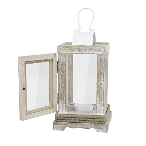 Stonebriar Coastal Worn White Wooden Tea Light Candle Lantern with Nautical Rope Detail and Metal Handle, 8 Inches