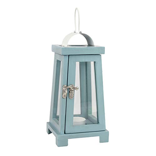 Nautical wooden lantern is durably made with worn light blue painted wood, metal, & clear glass and is protected to make use of indoor or out of doors