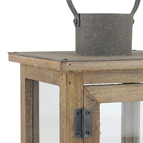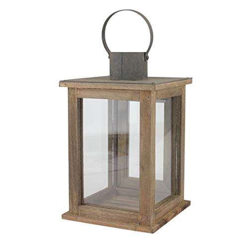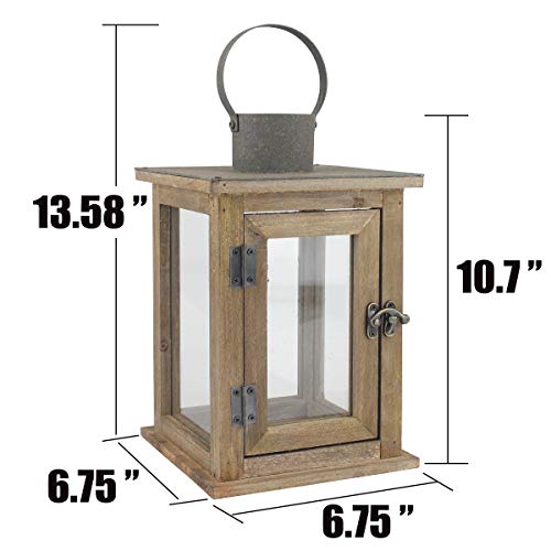 Rustic wooden lantern is durably made with evenly distressed wood, metal, & clear glass and can be utilized indoor or out of doors