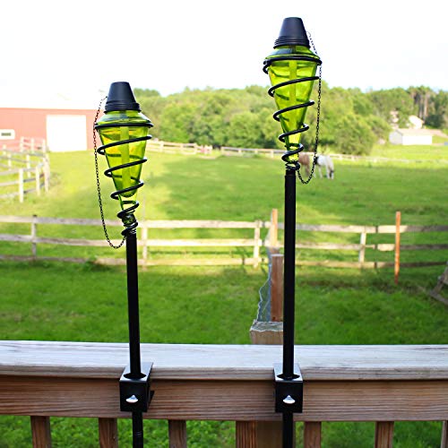 Complete pair of torches: Set of modern landscape torches includes two 4-section poles with 2 glass fuel containers, deck clamps, 2 fiberglass wicks for a flame that burns longer, 2 stakes, and 2 metal snuffers that are attached to each torch by a chain, so you safely extinguish flames when you’re done using the torches