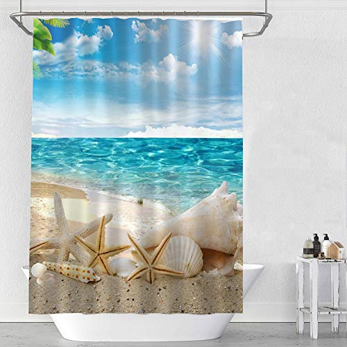 sylbapstry Beach Shower Curtain Fabric Washable Seashell Starfish Bathroom Decor Digital Printed No-Fade Blue 72 x 72…