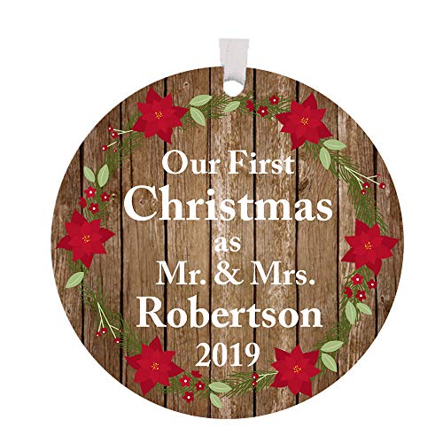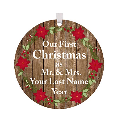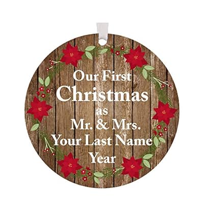 This adorable Our First Christmas as Mr. and Mrs personalized ornament is the perfect gift or keepsake for this years holiday season. Ornament price includes your choice of last name to make this a unique and special keepsake piece. High quality material to last for years. Includes attached ribbon for hanging on Christmas Tree or in your home around the year! This beautifully detailed ornaments with a rustic wood background and christmas poinsettia flower wreath design is approximately 3.5 inches. Note: Items that are customized specifically for the customer (such as monograms, names, embroidery, etc.) are not eligible for a return. Please refer to the “Customized Products” section of the Amazon Return Policy for more info and double-check all spelling prior to submitting your order.