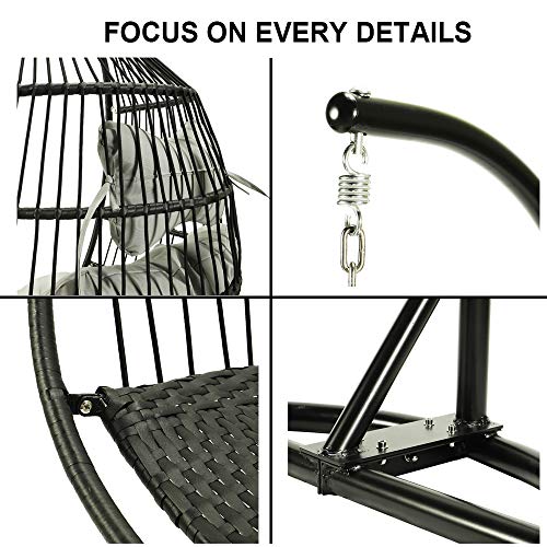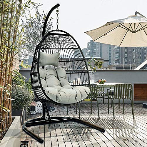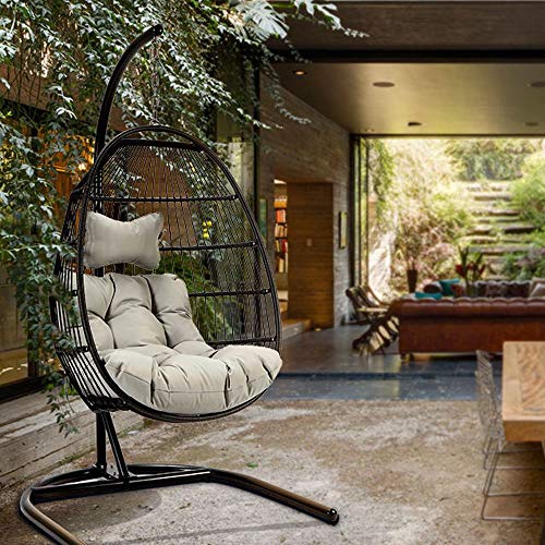 【Upgrade Design】①FOLDABLE design, easy to store when in no use. ②3mm thicken steel pipes, reinforced seat of the hanging chair, strong hook and chains can hold up the swing seat safely.③Ergonomic curved mid back perfectly supports your whole body very well.④5” thicken soft cushion with high density sponge, soft and comfortable; headrest pillow provided for reduce pressure and fatigue of your head and spine, offer lounging comfort like nothing you’ve experienced before.
