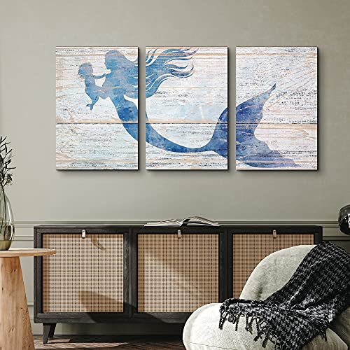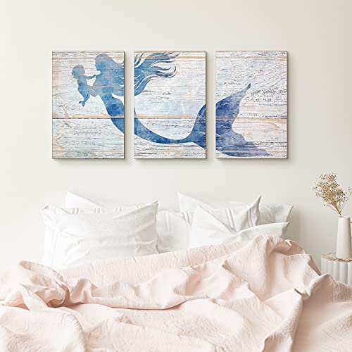 wall26 Canvas Print Wall Art Set Blue Watercolor Mermaid & Baby on Wood Panels Fantasy & Sci-Fi Wildlife Woodblock…