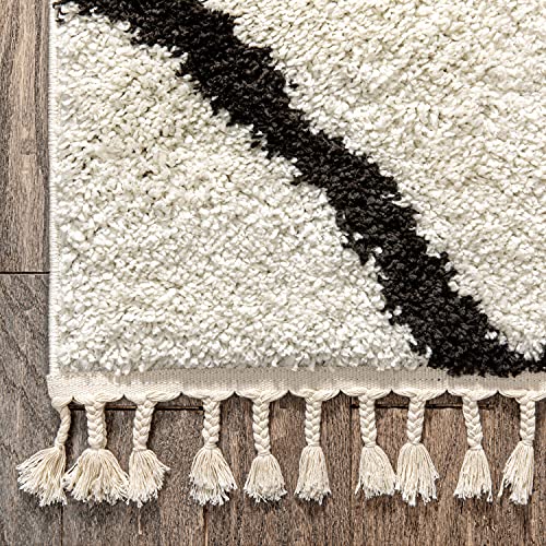 This cozy, Moroccan inspired design is bordered by cotton fringe that lends an authentic, textured look. The thick shag pile is soft soft, stain resistasnt, and easy to clean. Perfect for mid to high traffic areas. To deal with fluffy pile, periodically shake rug to loosen dirt and debris.