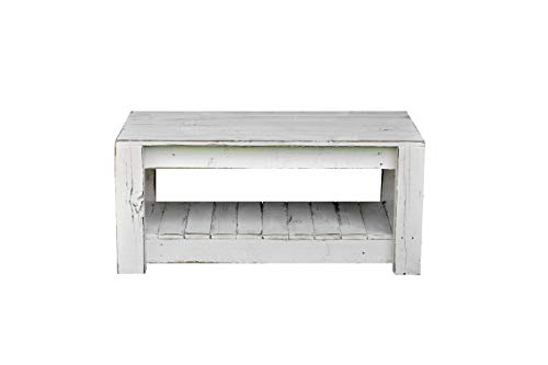 This beautiful White Farmhouse Coffee Table has been built from 100% reclaimed wood and comes with a roomy storage deck underneath for storing books, magazines and decor. Measures 40L x 20W x 18H with approximately 8 inches of storage height space underneath. The white on this table is not a bright stark white but moderately an antique off-white that completes the natural weathered look. Once the paint has dried it is sanded in all places for a smooth distressed finish. This piece will add the easiest rustic charm to your space. Each of our pieces are handmade with excellence and we guarantee You are going to receive the highest quality conceivable from the color finish to the structure and durability of its construction. You are going to love this piece! Please note that each piece is made to order so the natural wood color and texture may vary quite. Please remember the fact that our products are handmade from reclaimed wood so no two pieces will ever be the very same. Also, old nail holes, knot holes, and cracks may also be expected and are part of what adds the character to these one-of-a-kind pieces.