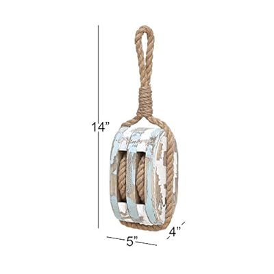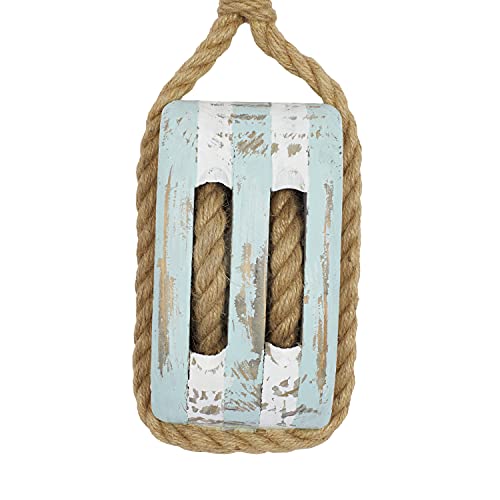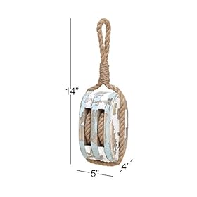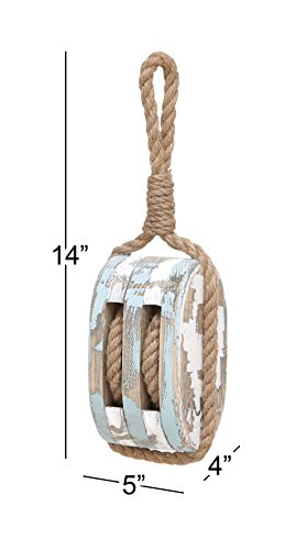 38702 wood nautical pulley with rope is Essential items for any sea voyage whether it is passenger ship or goods carrying ship. Bring this well known nautical Essential to give a unique blend to existing decoration of your home or office. It seems like ready to use pulley for lifting high the heavy goods. The pulley is hand painted in aqua blue and white tone leaving the traces of natural wood. The thick rope with nautical Knot comes as part of this nautical wood pulley. It can be hanged on the walls of corridors, verandah and warehouses too apart from your home rooms walls.
