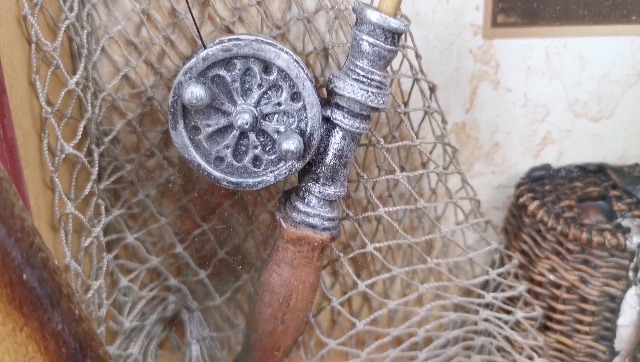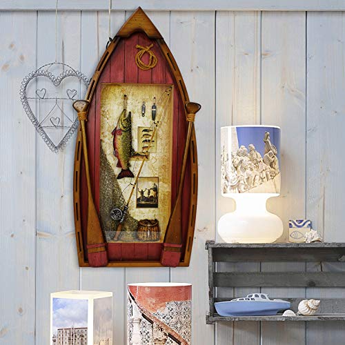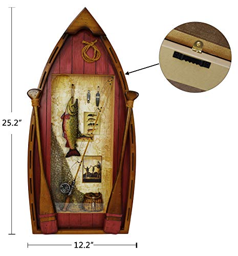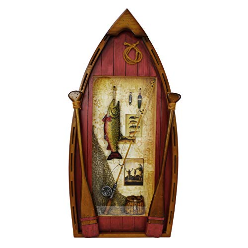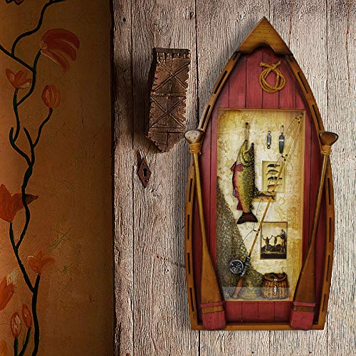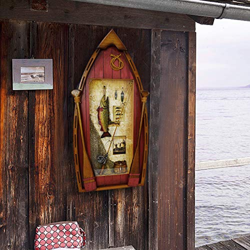 RUSTIC WOOD BOAT DECOR: Decorative boat wall decoration is hand carved from wood material painted into rustic color. Exquisite wood boat wall décor is detailed with decorative oars, fishing rod, fishing net, creel and a hanging fish décor, fit for most types of home decor style.