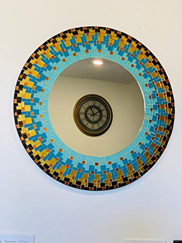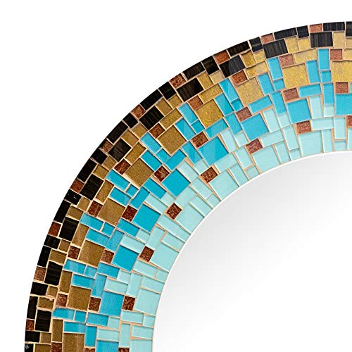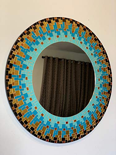 MOSAIC MASTERY – Mirror is handcrafted of with hundreds of small, square and rectangle glass mosaic pieces in black, brown, gold, turquoise blue, and aqua colors, placed on a sturdy MDF wooden base.